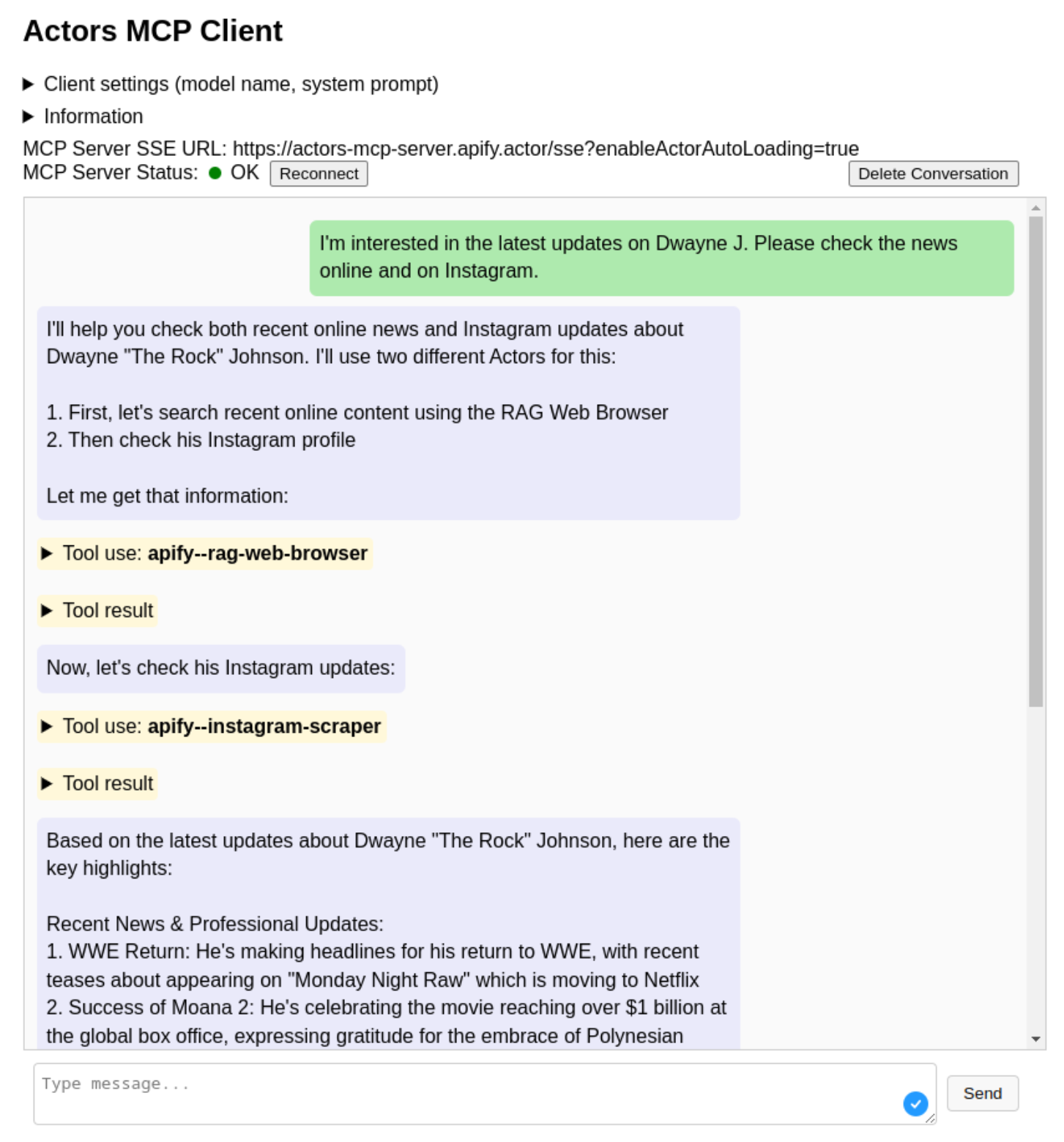一个通过 Server-Sent Events (SSE) 连接到任意 MCP 服务器并在类似聊天的 UI 中展示对话的客户端。 这是一个用于通过 SSE 测试 MCP 服务器的独立 Apify Actor,支持 Authorization 请求头。 使用原生 JavaScript(传统方式)构建并托管在 Apify 上,无需任何设置即可运行。